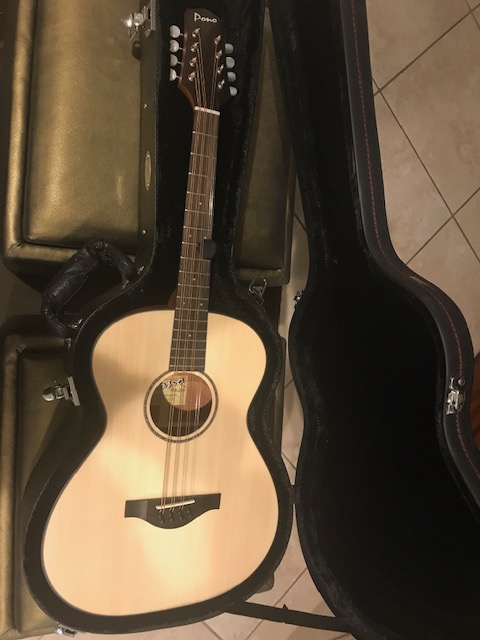 He showed me several student models. I asked him the difference between those and more expensive ones, and he explained about the differences in woods (solid or laminated), manufacturing processes (how much hand work was involved), and price (solid wood being pricier). I asked if he could play some from the different price ranges. I found it easy to hear the differences: the student models were nice, but the more expensive ones definitely sounded much better, having a nice, woody sounding low end and less harshness on the higher strings. He played a number of different ones, and I asked Hanna what she thought. Interestingly, she liked the same one as I did, a Collings MT O Oval Hole A Style with a satin finish for $2970.00 including a quality hardshell case. The salesman recommended that I get a good humidifier for it.